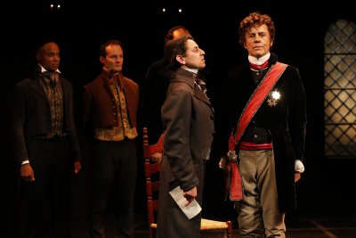 Under the assured and vigorous direction of Jeffrey B. Moss, Cuccioli is a strong robust Meyer, a man of integrity and ingenuity. However, at the performance under review, some of his songs seemed out of his vocal range. As his middle son Nathan, Christopher M. Williams demonstrates the necessary qualities of impatience, boldness and that of a risk-taker, but at times he is bland when he should be more decisive. Glory Crampton as Meyer’s wife Gutele gives able support but does not age much in the course of the four decades of the show’s plot. Most memorable is Mark Pinter as a series of imperious and scornful authority figures including Prince William and Prince Metternich. David Bryant Johnson, Jamie LaVerdiere, Nicholas Mongiardo-Cooper and Curtis Wiley playing the other Rothschild sons make them decidedly different from each other.