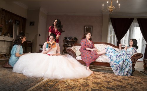 The play opens on Salme’s (Roxanna Hope Radja) wedding day. Nazanin (Marjan Neshat) is sewing on Salme’s dress as Rana (Nazanin Nour) fusses with Salme’s hair, and Shideh (Artemis Pebdani) files Zari’s (Nikki Massoud) toenails on the side.