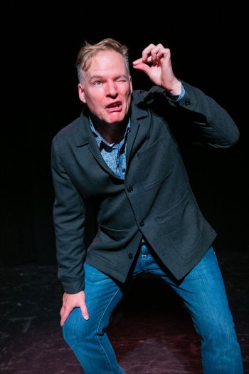 Toss a few other personalities in the mix, and you have quite the plethora of fanciful characters, all of which share a most deliciously common element being the single actor portraying all of them, playwright Jason Woods. Using some broad but quite inventive strokes, Woods manages to define each of these characters so fully that they spring to light and life beyond the space he occupies in his unassuming clothing. Vocal intonation, inflection, and accents all whirl together with a myriad of facial mutations, hand gestures and body postures so quickly and vividly that one truly forgets there is just one person on stage.
