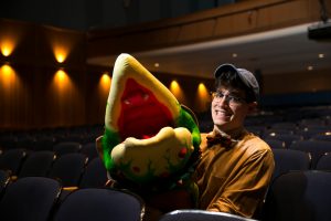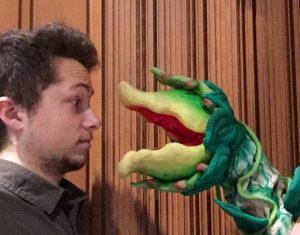 And the various puppets representing the ever-growing man-eating plant (“Audrey II”)–such an important part of this show–were handled in a first-rate way, as well as I’ve ever seen it done anywhere. I respect that professionalism, which you don’t always find at the college level. Throughout the show, the puppet always seemed like a living creature, and I want to compliment everyone who made that possible, from Peter Charney (seen in the photo), who directed the puppet work, to Mason Sansonia, who provided the resonant voice, to puppeteers Lyndsay Crescenti, Roseanna Zeramo, Lisa Delia. (When that puppet tilted its head just so, and paused exactly the right length of time before answering “Well…”–after being asked if it would settle for some roast beef instead of human blood–it was as important a member of the cast as any humans seen on stage. It felt like a Jack Benny moment. Nicely done.)