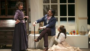 As “Lopakhin,” Justin Chevalier’s strength, excellent diction and projection, and understanding of his character, impressed, too. I very much enjoyed Bryan Raiton as the arrogant, ambitious “Yasha”—a smaller role, but carried off with finesse. He was perfect in that role. And his body language spoke volumes, even when he did not have lines to say. (College actors don’t always understand—as Raiton clearly does—that you act with your whole body, and you never slip out of character. He was “Yasha”—haughty and pleased with himself—even when he stood silently, facing away.)