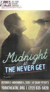 The York Theater has long served as an incubator for new musicals; that’s its primary mission. Some of the new musicals work; many more don’t. That’s just the nature of the business. Their current offering, Midnight at the Never Get, is the best new musical I’ve seen at the York in a long time.