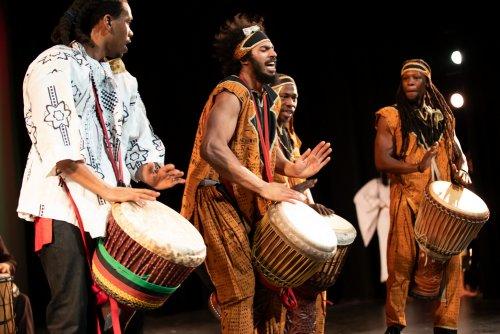 Nballou Bangoura and Drummers in a scene from the Asase Yaa African American Dance Theater’s production of “Drum Love” (Photo credit: Solwazi Afi Olusola)