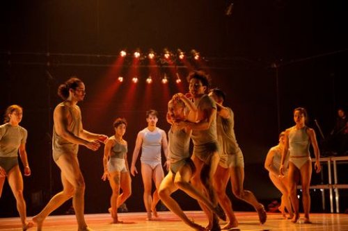 Using street dance—hip-hop, capoeira and martial arts movements with modern dance tossed into the mix—Quijada constructed a work that began innocently with the ten dancers, dressed in Cloé Alain-Gendreau’s bland overalls, walking about, occasionally twisting, undulating, forming and reforming lines, breaking off into solos and duets and recoalescing.