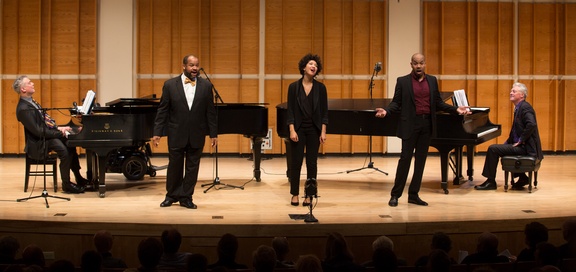 Steven Blier, James Martin, Julia Bullock, Darius De Haas, and Michael Barrett as they appeared in New York Festival of Song’s “Harlem Renaissance” (December 9, 2014) (Photo credit: Matthew Murphy)