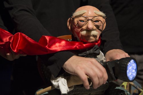 Various types of puppetry enable fluid transitions back and forth between reality and fantasy. Both rod and tabletop puppetry work in conjunction with each other to tell Blossom’s story from when he was a young man until he gets closer to death. During his five-year stay at the nursing home, Blossom increasingly looses mobility. Blossom begins as a rod puppet and then merges into a shadow puppet with voice-over narrations, as he is less and less able to move freely.