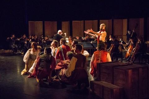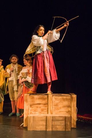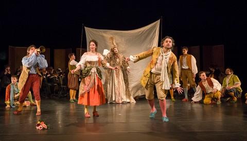 Unlike the company’s 2016 luxuriously staged Les Fêtes Vénitiennes, also at the Gilman, Rameau was purposely staged by Sophie Daneman as if in a village square, simply but effectively, the “effects” improvised as only peasants would: entrances to temples and heaven were curtains stretched between two poles; Jupiter appeared in a high stage box as an improvised Mount Olympus; a dancer as a god glided bare-chested undetected amongst the celebrating peasantry. According to the program, this type of performance is called “théâtre de la foire” (theater of the fair).