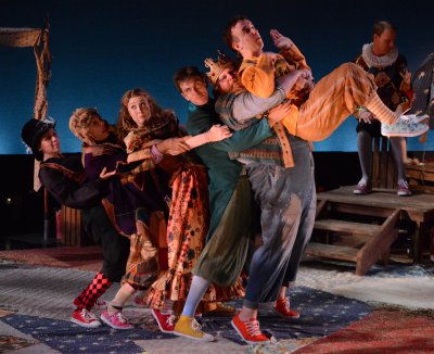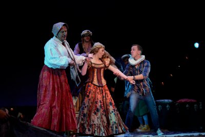But to dwell on these aspects is to ignore its numerous merits: despite the handful of missteps, Foolerie is on the whole a lovely little anachronistic romp straddling the 16th and 21st centuries. DeAngelo succeeds in creating a tuneful pastiche score with hints of Elizabethan whimsy and contemporary pop. Director Tralen Doler matches the script and score with equally charming direction that (mercifully) incorporates the perfect amount of audience participation: scenic designer Jen Price Fick’s charmingly haphazard set seats approximately twelve audience members onstage, and throughout the show, they are asked to help the players further the plot.