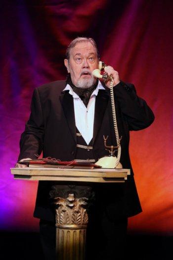 As the Jewish mother who has her own expectations for her son’s future, Alison Fraser nails the guilt trip that doesn’t seem to have any effect on her son David. Robert Picardo as David’s father is low-key but makes his presence felt. Ray DeMattis returning to the role of Mr. Forman from the 2008-9 productions has the dry wit and quick comebacks that the role requires. Allie Trimm’s Wanda is delightful as David’s ever-suspicious girlfriend. Raji Ahsan demonstrates a dry wit as Pike, Marlowe’s stage manager. Dana Costello as Miss B., secretary at La Tesh Hats, is quite a looker. As David’s high school friend Marvin, Joe Veale is amusingly callow in the way of teenagers. Artistic director James Morgan puts in a surprise second act appearance hiding under the anagram of “Magnes Jarmo” in one of those vaudeville straight-man comedy roles.