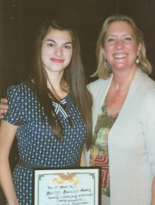 Although she was three thousand miles away, giving a concert on the West Coast, when the first annual “Betty Buckley Award” was presented at the 13th Street Repertory Theater in New York City, Betty Buckley served as the official presenter on videotape. Introduced by master-of-ceremonies Chip Deffaa, whose plays have often been presented at the 13th Street Rep, Buckley–on videotape–presented the award to 18-year-old Emily Bordonaro of Avon, Connecticut.