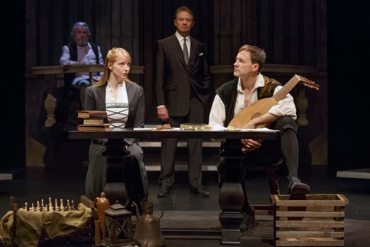 John Michalski, Kersti Bryan, Paul Schoeffler and Fletcher McTaggart in a scene from “Martin Luther on Trial” (Photo credit: Joan Marcus)