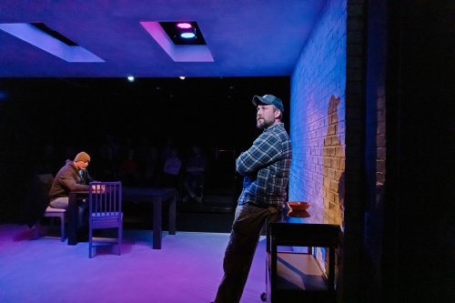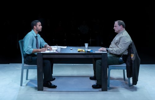 In the first several scenes, Solomo n Weisbard’s lighting design provides a steady glare, denoting, it seems, the naked exposure by the community of a man’s failure to measure up. Not until the scene between Andy and Dan Watson, the shooter’s father—set in a bar where the once proudly sober Andy goes to seed—do we get a moment with refuge from this punishing light.