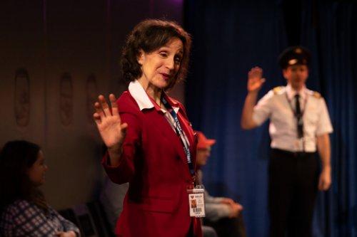 Bonnie’s Last Flight peppers its character moments with humorous sketches and air travel anecdotes. Some don’t hit their mark, but most do. There’s an especially amusing and thoughtful moment where the audience is handed landing cards on which they’re invited to “lighten their emotional luggage upon arrival.” All “passengers” are asked to “write down whatever’s been weighing you down: a fear, a hurt, a grudge, anything you’re ready to let go of—anything to lessen the emotional kilos you carry around. When we do our trash collection shortly we will also take the emotional waste you wish to dispose of. Namaste.” I’m quite certain every person in the audience felt better after their card was taken out with the trash, present company included.