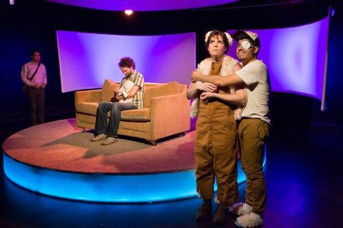 The stage has a round platform on which are a couch, some furniture and the blue plastic hamster cage. It’s all surrounded by curved white panels that add a compelling sense of atmosphere. With inspired simplicity, Brian Dudkiewicz’s scenic design is major achievement of the production.