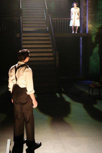 Christopher Barreca’s setting is a physical reminder of the world they live in. The thrust stage has six chairs that first represent the store room where Chris works and later the train taking Kay to New York. In the rear of the stage is a two story staircase with a landing halfway up, which ends in a far-off doorway. The stairway divides the stage in half, at the same time depicting the distance that Kay and Chris have to travel to meet up with each other. Austin Switser’s video design makes this poetic play more realistic with its depiction of solid object and people which floats over the stage. Montana Levi Blanco has designed elegant clothing changes for Kay, suggesting that her unseen father is paying for her education and lifestyle. Chris’ bland formal 1941 outfit gives way to his suit for his 1875 role in the Noel Coward operetta which immediately set the tone for this sequence. Donald Holder’s moody lighting which occasional throws long shadows and silhouettes puts everything in half-light as though being perceived through memory or a dream. Justin Ellington’s melancholy music also beautifully captures the mood of the play.