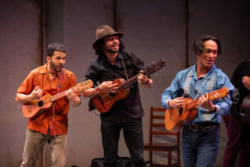 Carlo Albán, Sinuhé Padilla and Andrés Quintero in a scene from “Fandango for Butterflies (and Coyotes)” produced by En Garde Arts (Photo credit: Maria Baranova)