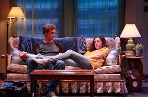 Talene Monahon and Peter Mark Kendall in a scene from Chad Beckim’s “Nothing Gold Can Stay” at The Jeffrey and Paula Gural Theatre at The A.R.T./New York Theatres (Photo credit: Spencer Moses)