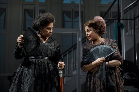 Nedra McClyde and Lynda Gravátt in a scene from Marcus Gardley’s “The House That Will Not Stand” (Photo credit: Joan Marcus)