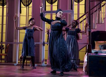 While Adam Rigg’s large elegant parlor with its nine sets of French doors and elaborate crystal chandeliers with twinkling candles alongside the sisters’ bedroom with a four-poster bed sets the scene for the mansion in Faubourg Tremé in 1813 New Orleans. However, Yi Zhao’s lighting tends to avoid creating much atmosphere aside from occasionally bathing the stage in various colored mood lights. Montana Levi Blanco has designed beautiful, flattering 19th century gowns for all of the women. Justin Ellington’s lovely, original music is redolent of New Orleans with its jazz undertones. Raja Feather Kelly’s movement includes Makeda’s voodoo ceremony and the sisters’ ballroom dancing lesson.