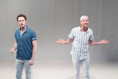 They are the dark-haired Patrick Foley and the backwards baseball cap wearing Michael Breslin who are clad in credited costume designer Cole McCarty’s street clothes. With a nod to Brecht, they also wrote This American Wife with the assistance of two dramaturgs, Catherine María Rodríguez and Ariel Sibert. There is no billed director. The duo resolutely demonstrates a paucity of talent in both fields as they assuredly carry on with the supreme confidence of indulged youth.