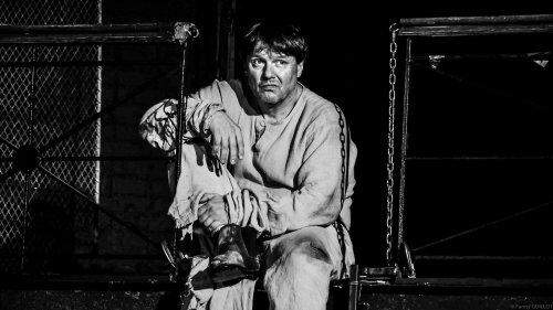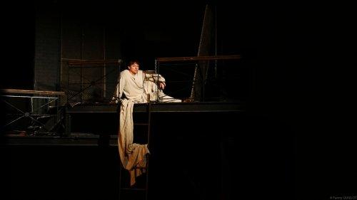 Director Eugene Lazarev has Mr. Volok all over the large, bare and black stage. Up on a ramp high above, on a staircase, down front and center stage. It’s all visually arresting but the production would have benefitted if Mr. Lazarev had also paced and varied Volok’s vocal delivery.