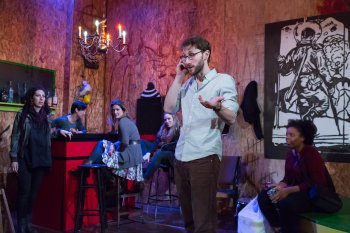 Gancher organizes her play around the conceit of using a young, ex-pat American videographer, Aisha (Isabelle Pierre in a wonderfully matter-of-fact performance) to document this venue and the people who inhabit it and spread their message. As she catches each member of this circle in searching autobiographical monologues, we get their back stories—probably too many of them. We find that the magic of the Seagull attracts young people of various backgrounds, professions, religious fervor and political sensibilities. We watch as they face a thirty-six hour countdown to a face-off with the federal police who mean to not only arrest them, but impose physical violence and eradicate them and their den of iniquity. It is clear that their religion and their loud-and-clear expression of it (not to mention their anti-government rhetoric) is the motivating force in this de facto impending “mini-pogrom.”