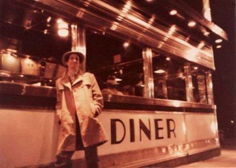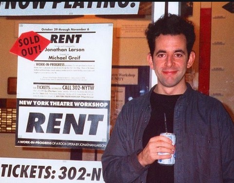 Jonathan Larson in front of “Rent” poster at New York Theatre Workshop