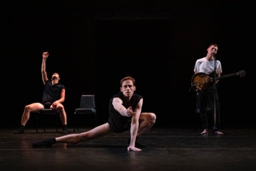 Robbie Fairchild, Edward Watson and vocalist/guitarist Dan Gillespie Sills in a scene from Javier de Frutos’ “3 with D,” part of The Joyce Theatre’s Ballet Festival: Program D (Photo credit: Maria Baranova)