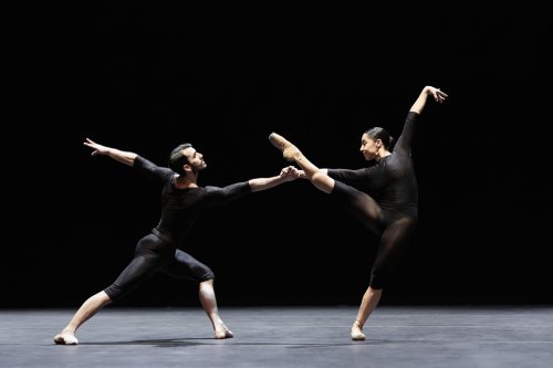 Fatima Andere (on point) and Antonio Cangiano, dressed in body-hugging black (costumes by the choreographer), brilliantly breezed through Forsythe’s grab-bag of virtuoso grabby partnering. They spun and slinked away from each other only to meet for more off-balance balletic wrestling, managing to establish nothing but an adversary relationship. The fine lighting—Forsythe, again—was moody in a noirish way.