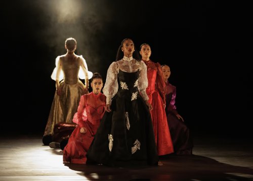 Gabrielle Sprauve with Amanda del Valle, Isabella Vergra, Cori Lewis in Michelle Manzanales and Company’s “Sor Juana” seen at Ballet Hispánico’s spring 2023 season at New York City Center (Photo credit: Erin Baiano)