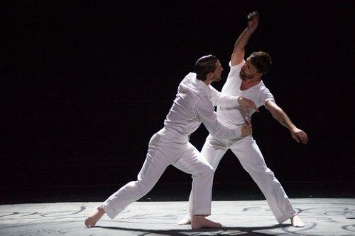 Chris Bloom and Omar Román De Jesús in a scene from Ballet Hispánico’s “Espiritus Gemelos” (Photo credit: Paul Lobo)