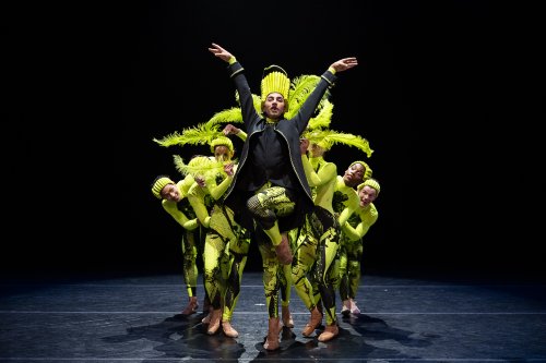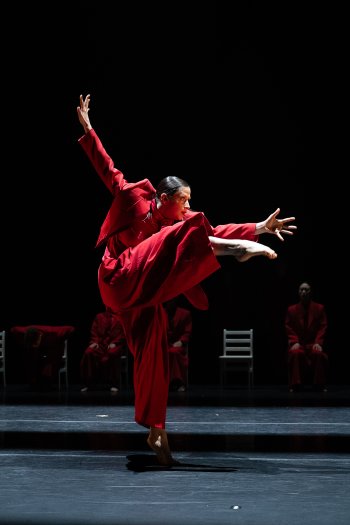 The rest of the large cast entered marching onto chairs arranged in a straight line. The chairs were subsequently rearranged into constantly surprising formations, used by the dancers as pathways and launching pads for eye-catching leaps. As the music thundered on, the movements became more and more frenetic, the partnering more daring.