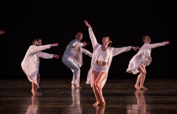 Dressed in Norma Kamali’s chic—very un-Shaker!—loose white outfits, the dancers took to Tharp’s detailed gestures (loose hands, bobbing heads) and came across as a little community celebrating themselves. Most impressive was the all-male section, “Chesterfield,” in which the six men, a funeral entourage, carried in a body. With virtuoso, acrobatic panache, the body was replaced several times by other dancers as they trooped across the stage. This witty commentary on death was both moving and beautiful. Perhaps the dancers missed some of Tharp’s edgier qualities, but the overall effect was lovely.