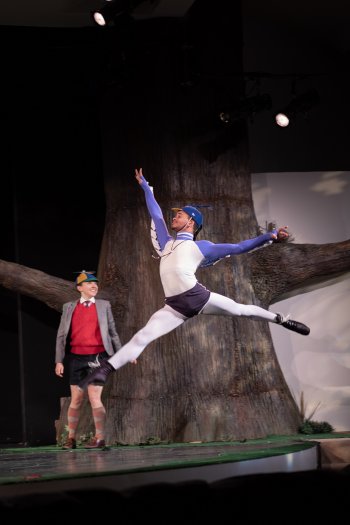 The set evoked a dreamy Central Park with a silhouette of Manhattan’s celebrated skyline in the background. A large tree, downstage left, provided a bough on which sat the Bird (young Maxfield Haynes, his arms covered in blue cloth wings, a dancer with birdlike grace on point). The orchestra pit, lined with reflective material was the pond from which the Duck (Marjorie Folkman, properly ditzy, all in orange, including orange flippers).