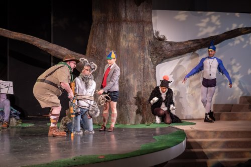 Finally, Mizrahi was able to relate the tale of Peter escaping the comfort of Grandfather’s house, leaving the gate open so that the Duck could escape and take a swim in the pond. The Duck and the Bird exchanged insults while stalked by the Cat (Kristen Foote, sinuous and wily). The Wolf (a sexy Daniel Pettrow), as warned by Grandfather, manages to eat the poor Duck before being shot by the Hunter (Derrick Arthur, hilariously bedecked in a Boy Scout uniform). The Duck got the last word from inside the tummy of the Wolf.