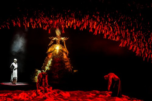 Incredibly, only eleven chorus members—evenly divided between men and women—portrayed legions of warriors, courtiers and townspeople, a tribute to Ms. Yang’s ability to choreograph and animate crowds with exactness and dramatic perception.