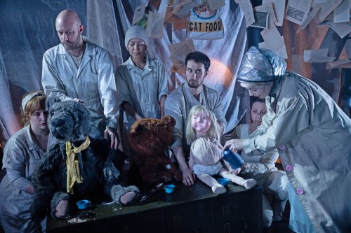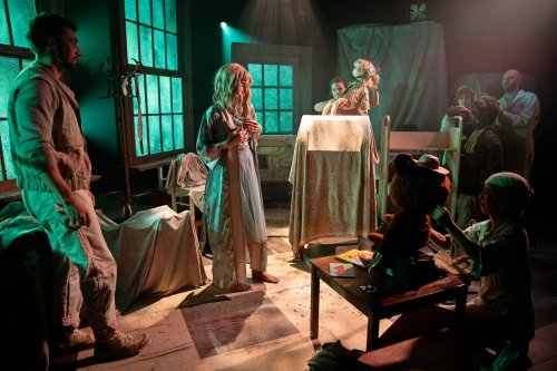 She moves around the objects in the room and begins to explore what is hidden beneath the covering shrouds. As she does this, five people dressed in white jumpsuits appear at different places on the set. These people are the puppeteers who will expertly bring three key objects to life: two teddy bears and a doll. These objects are the primary characters of Wright’s book The Lonely Doll, and will play the central role in guiding her through this liminal experience.
