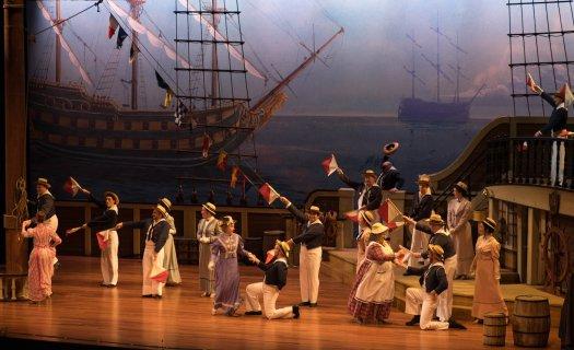 While H.M.S. Pinafore has a great many well-known tunes (“We Sail the Ocean Blue,” “I’m Called Little Buttercup,” “Now Give Three Cheers,” “When I Was A Lad,” “Things Are Never What They Seem,” “Carefully on Tiptoe Stealing,” “A Many Years Ago,” and “Oh Joy, Oh Rapture Unforeseen”), it also has a great many unfamiliar tunes. Among the most memorably show-stopping stagings are “A British Tar” in which Ralph, the Boatswain’s Mate and the Carpenter’s Mate all do the hornpipe, and Josephine, the Captain and Sir Joseph’s rendition of “Never Mind the Why and Wherefore” in which the tiny Midshipmite continually delivers larger and larger bells to the trio for more and more choruses until they threaten to shoot the conductor if he plays yet another encore.