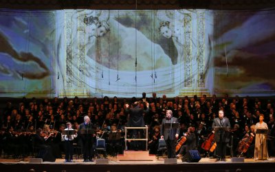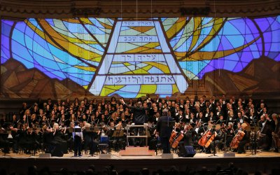 At the very end of the whole work, as the images presented conveyed luminous and golden heavenly glory, texts in Hebrew scrolled up along the wall. Non-Hebrew-reading audience members – no doubt the majority of the audience – were left to wonder what the texts were: Genesis I? the Ten Commandments? Psalm 26 (from which most of the text of the final chorus was adapted)? Audience members also noted that the heavenwards scrolling text, proceeding up along the back wall as the orchestra and chorus sang triumphantly of God’s redemption, looked alarmingly like 1940’s Hollywood wartime morale-boosting films’ scrolling credits soaring up into the wild and patriotic blue yonder.