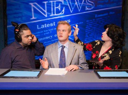 Justin Rodriguez, Isaac Miller and Gabrielle Sarrubbo in a scene from “America’s Favorite Newscaster” (Photo credit: Jeremy Daniel)