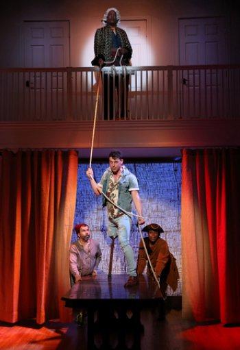 Rene Ruiz is most amusing as the pun-loving, malaprop-spouting narrator and jack of all trades Partridge, with a part beefed up from the original. Alie B. Gorrie is unrecognizable as the lusty wench Molly and the demure Harriet. Matthew McGloin demonstrates his range with the insincerely pious Blifil, the furious Mr. Fitzpatrick and limp Lord Fellamar who can’t keep up with the sexual needs of Lady Bellaston. Cheryl Stern is cheerfully hypochondriacal as Bridget Allworthy, the squire’s sickly sister who succumbs soon into the story and as the crotchety but lively Landlady Nanny. Though not seen as much as some of the other characters, Tony Perry gets to play two characters at opposite ends of the spectrum: the upright and sober Squire Allworthy and the crazed Loony Mum to Landlady Nanny.