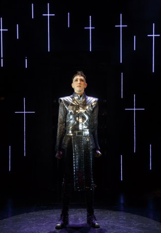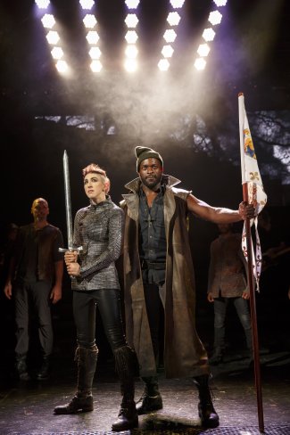 Timbers’ direction, usually so original and inventive, is here rather conventional and tame. The most effective scene is one in which the male ensemble play both French and then English soldiers which surprises us by having one costume on the front and another on their backs in Clint Ramos’ unusual and witty design. Aside from his rather modernistic costumes for Joan, the rest of the outfits for the soldiers, priests and courtiers are what you would expect for a contemporary rock opera. Christopher Barreca’s black unit set which continually breaks apart to create various locales is serviceable without being visually interesting or attractive. Much of the work is performed by the projection designs by Darrel Maloney on a huge screen above the set. Justin Townsend’s lighting is the most effective production element. Various moments are the work of special effects designer Jeremy Chernick.