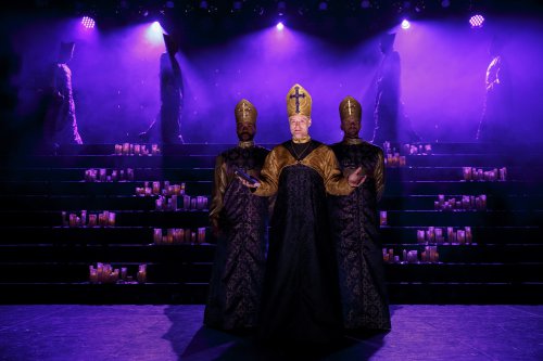 James Brown III, Sean Allan Krill and Adam Perry in a scene from “Joan of Arc: Into the Fire” (Photo credit: Joan Marcus)