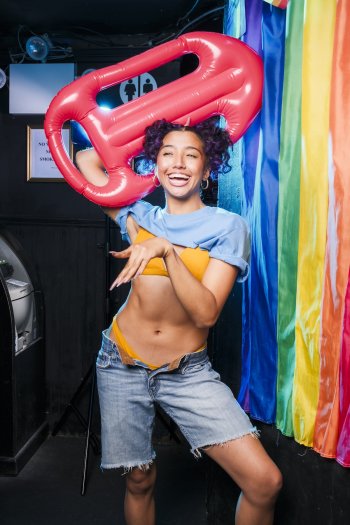 Scenic and lighting designers Shawn Lewis and Zach Pizza have totally transformed the upstairs room at The Duplex, removing the cabaret tables and chairs, and covering the walls and floor with festive, fluorescent splashes. Banquettes line the port and starboard sides, giving the feel of being on a ferry (but with cushions, praise Judy!) while the oft-immersive action takes place center-stage and forward.