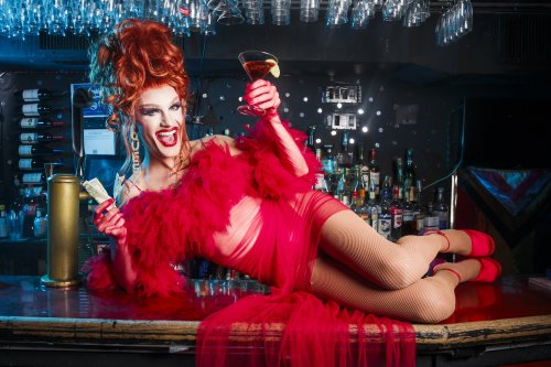 The bar opens an hour before curtain (there is no curtain), and a cocktail or three is a perfect social lubricant to prepare the audience as they cast off. Just before show starts, statuesque drag queen Xana DuMe (Felipe Galganni), sporting sparkling heels and festively fiery red hair, red lips, and red garb leads the audience in a catchy theme song with lots of rounds of “We’re on Fire <clap clap> Island,” to which the attendees clap with glee. Xana is joined by three sexed up girly-girl Greek chorines (Kailin Brown, Manuela Agudelo, and Kelsey Rogers) who constantly change their very clever outfits (courtesy of delightful costume designer Tyler Holland) and dance in and out of the 17 or 23 songs featured in the production.
