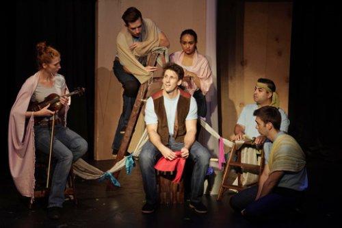 Bock and Harnick’s “The Diary of Adam and Eve” is really a one-gimmick plot as are the adaptations of all three stories, and the jokes now seem 100 years old. Muscular, well-built Garen McRoberts has a boyish charm but does not seem to grow or change much in the course of the story as Adam grows older. Savannah Frazier’s low-key performance as Eve is sweet but the show needs more to make it work. As the Balladeer, the voice of God and the Snake, Matthew LaBanca in an underwritten role makes a good deal out of his one song, but mainly fades into the background. The five person ensemble played by Marc de la Concha, Elizabeth Flanagan, Alia Hodge and Evan Maltby and Wesley Tunison play all the animals in Eden wearing assorted shawls and scarf (in pale colors) but aren’t given much movement to make their roles stand out.