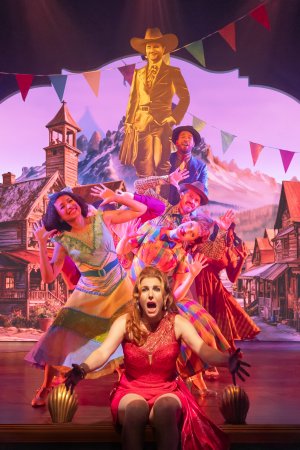 While the show bills itself as a parody of golden age musicals, it begins with a tribute to MGM’s 1940’s small town movie musicals like Meet Me in St. Louis, The Harvey Girls and Seven Brides for Seven Brothers. It then takes on Golden Age Broadway musicals from Oklahoma! to Gentleman Prefer Blondes, not stopping there but going up to A Chorus Line and Rent. The second half of the show is modeled on The Wizard of Oz (1939) and The Wiz (1975).
