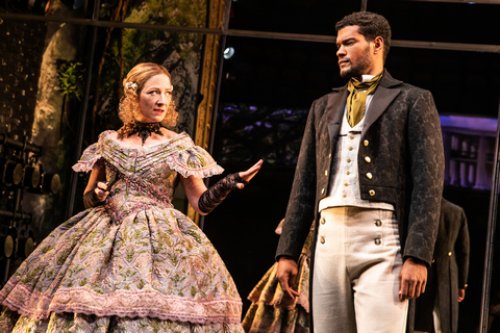 The stage is set with an enveloping mirrored configuration combined with a projection of the plantation and imagery of trees. Scenic designer Clint Ramos’ tantalizing creations offer the promise that we’ll see something unique. Jiyoun Chang’s artful lighting design shifts with the narrative’s changes. Sound designer Lindsay Jones’ work renders his pulsing original score and effects with flair. Witty recreations of 19th century garments and sedate everyday wear are the elements of Dede Ayite’s perfect costume design.