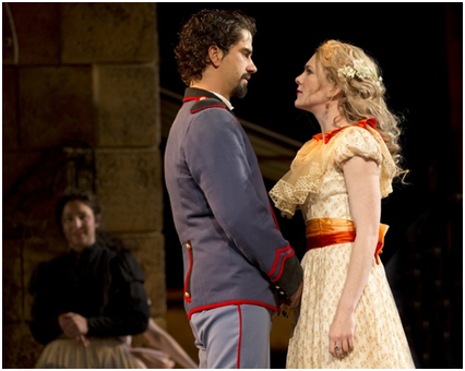 As the young lovers, Hero and Claudio, Ismenia Mendes and Jack Cutmore-Scott make an attractive couple and become extremely impassioned when the stakes are raised. In a role often taken for granted, David Manis as Leonato’s brother Antonio is also quite emotional when his niece’s honor is impugned. Pedro Pascal (most recently of HBO’s Game of Thrones) is a low-key Don John rather than the usual over-the-top villain which is all the more frightening. As the constable who can’t get a word correct, John Pankow makes the unusual decision to play this as a character part rather than as a comic one, which gives him more weight but makes his scenes less humorous. Kathryn Meisle as Hero’s governess is as feisty a woman as Beatrice. All are dressed in Jane Greenwood’s charming and colorful late Victorian costumes. Jeff Croiter’s lighting design bathes the set in the sun of Italy whether it is for daylight or during the moonlight scenes.