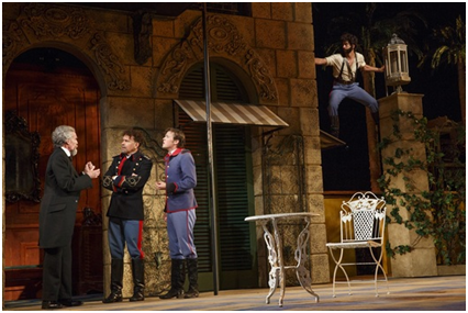 The magnificent setting depicting an attractive estate in Sicily is the work of John Lee Beatty. A two-story villa with a second floor balcony is in a lovely park which includes a vegetable and flower garden, a large orange tree (good for hiding), and a working stone fountain, as well as an ivy covered wall which is susceptible to music and conveniently moves when played to sweetly. In keeping with the Italianate setting, the play begins with the cast speaking Italian and then segues into English at just the right moment. To the home of Leonato, Governor of Messina, comes his friend Don Pedro, the Prince of Aragon, back from the wars with his seconds-in-command, young Count Claudio and sworn bachelor Benedick, lord of Padua, as well as his dour half-brother Don John. Living with Leonato are his daughter Hero and her cousin Beatrice who has had a thorny relationship with Benedick in the past. They immediately pick up their witty duel of words as soon as they meet. Hero and Claudio become engaged at the masked ball given for the visitors and the rancorous, jealous Don John along with his followers Borachio and Conrade decide to spoil this relationship.